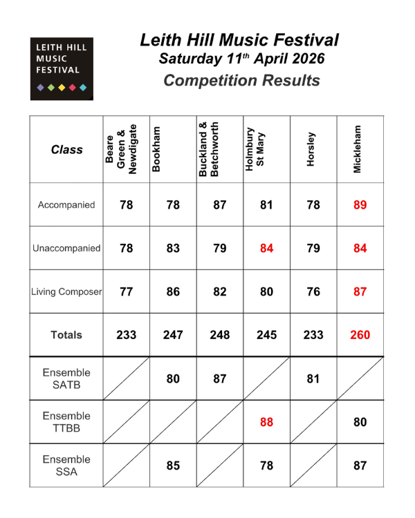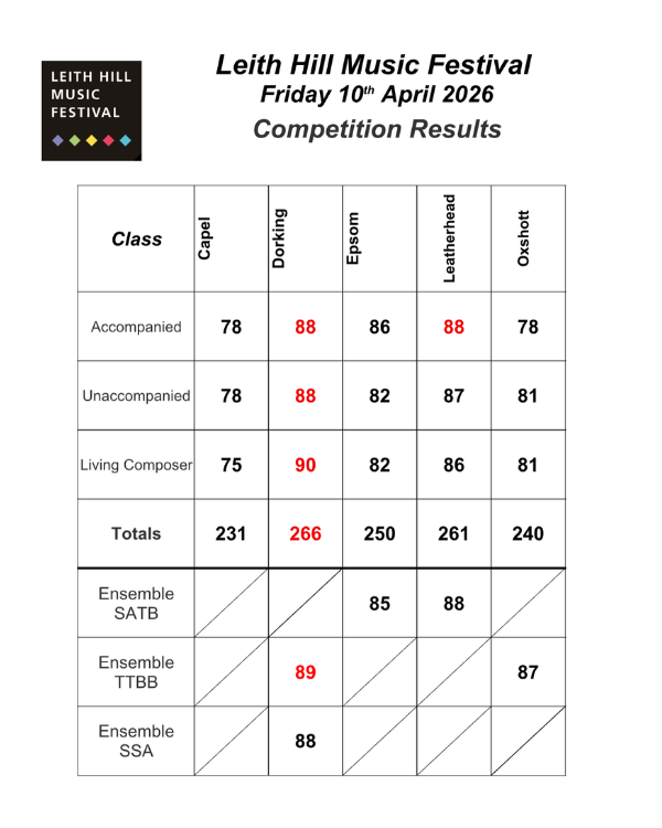 Leith Hill Music Festival is a competitive choral festival for amateur choirs in the Surrey area held over two days in April with a combined concert each evening.