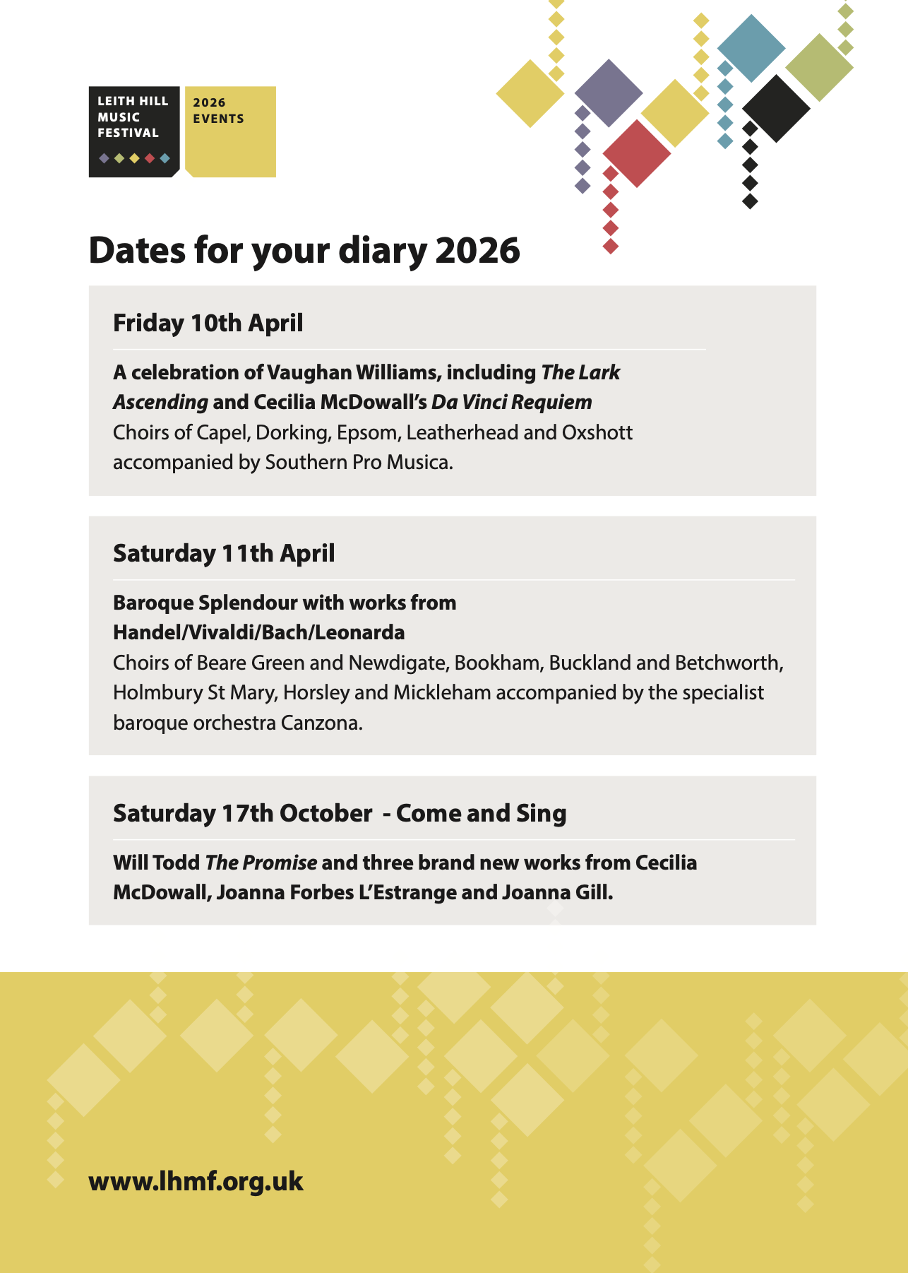 This event is open to singers from the Leith Hill Choirs and independent singers and cumulating in a magnificent concert with renowned soloists and the splendid baroque orchestra Canzona.